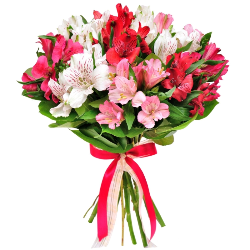 Букет состоит из MIX из 15 альстромерий, прозрачная упаковка, атласная лента.