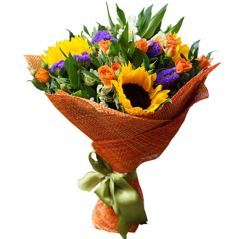 Альстромерия 6 шт., Подсолнух 3 шт., Роза кустовая 5 шт., Статица 5 шт. |