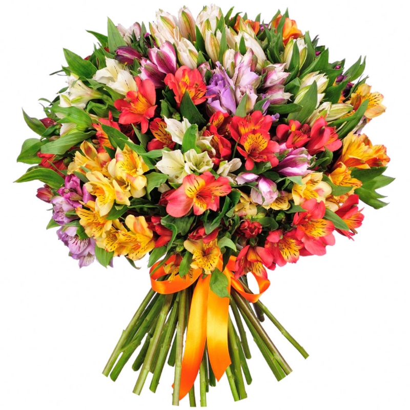 Букет состоит из MIX из 31 ветки альстромерий, прозрачная упаковка, атласная лента.