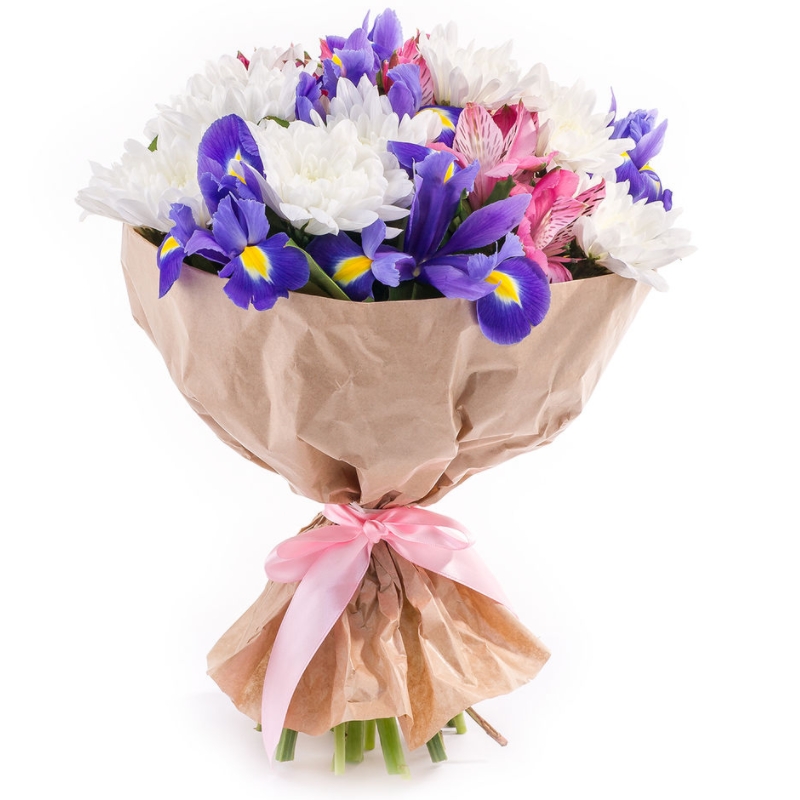 Букет состоит из 5 кустовых хризантем, 7 ирисов, 3 альстромерии, салал, крафт, атласная лента.