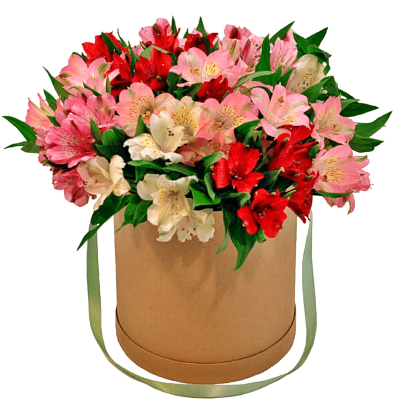 Букет состоит из 15 разноцветных альстромерий, зелень, коробка, оазис.