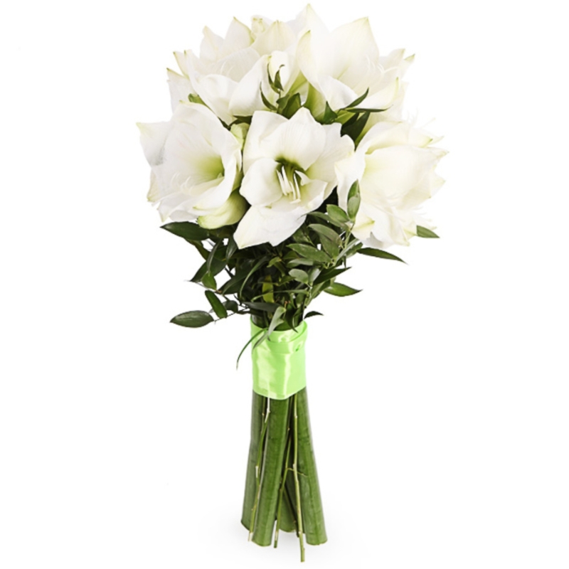 Букет состоит из 5 белых амариллисов, зелень, прозрачная упаковка, атласная лента.