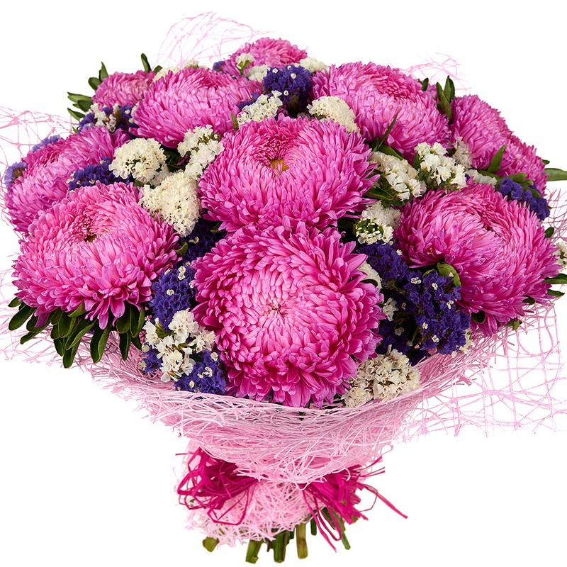 Букет состоит из 13 розовых астр, 5 статица, зелень, красивая упаковка, атласная лента.