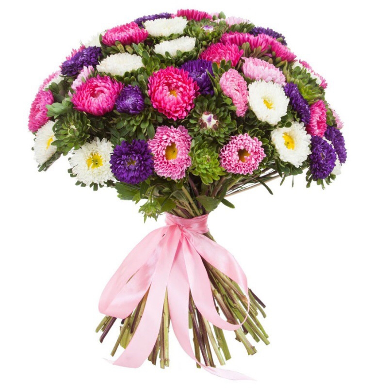 Букет состоит из MIX из 45 астр, зелень, прозрачная упаковка, атласная лента.