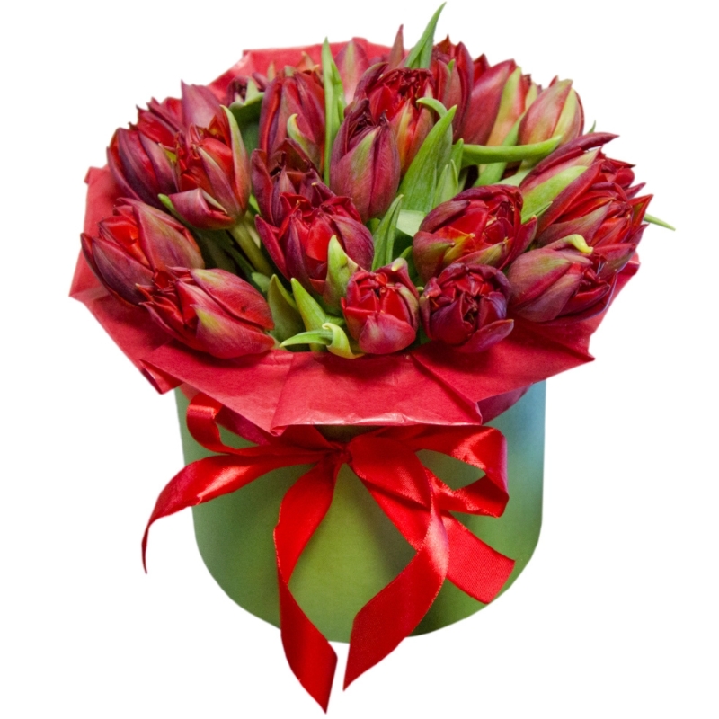 Букет состоит из 21 красный тюльпан, коробка, атласная лента, оазис.