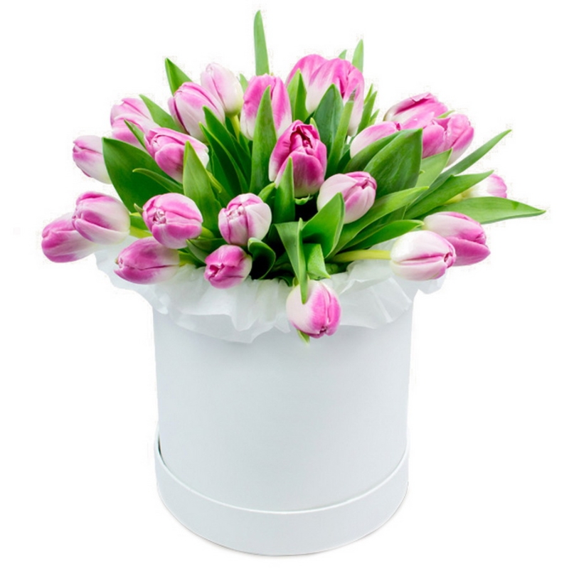 Букет состоит из 25 розовых тюльпанов, коробка, оазис.