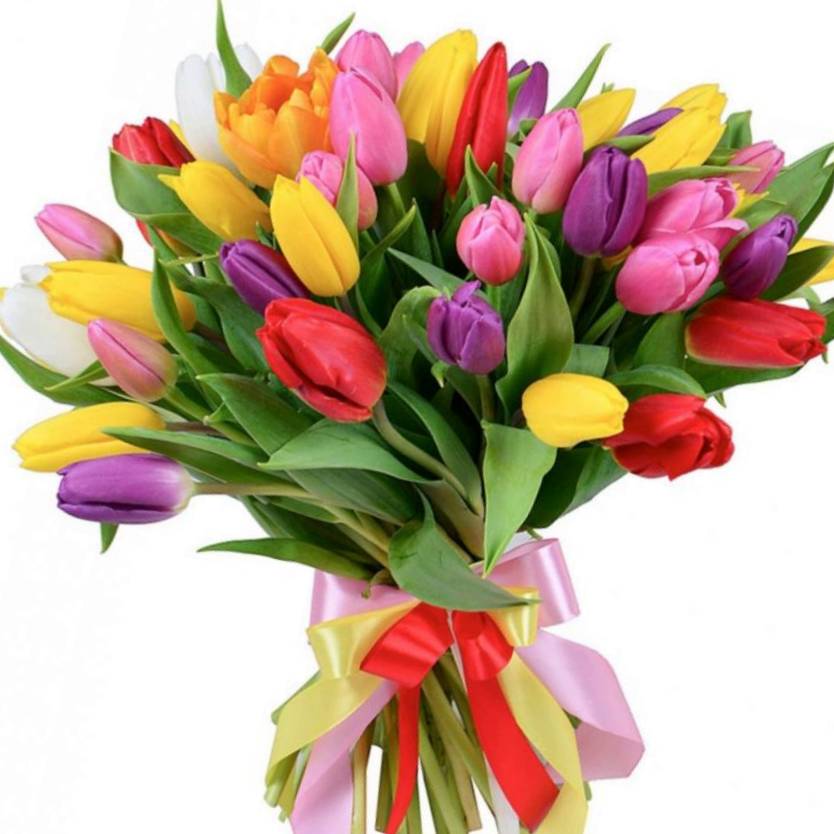 Букет состоит из MIX из белых / желтых / розовых / красных / малиновых тюльпанов, прозрачная упаковка, атласная лента.