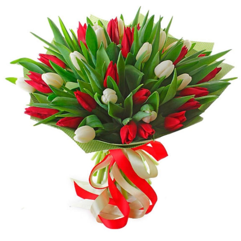 Букет состоит из 18 красных тюльпанов, 17 белых тюльпанов, красивая упаковка, атласная лента.