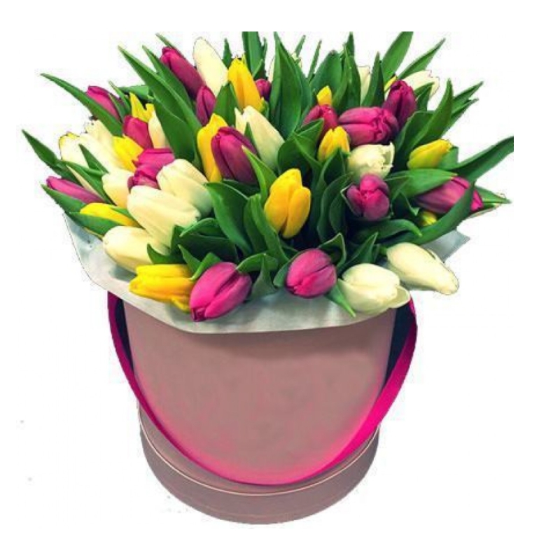Букет состоит из MIX из 51 тюльпана, коробка, оазис.