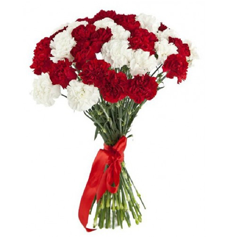 Букет состоит из 20 красных гвоздик, 20 белых гвоздик, прозрачная упаковка, лента.