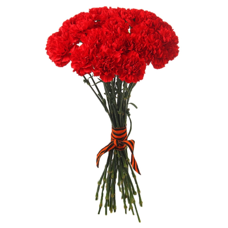 Букет состоит из 22 красные гвоздики, прозрачная упаковка, атласная лента.