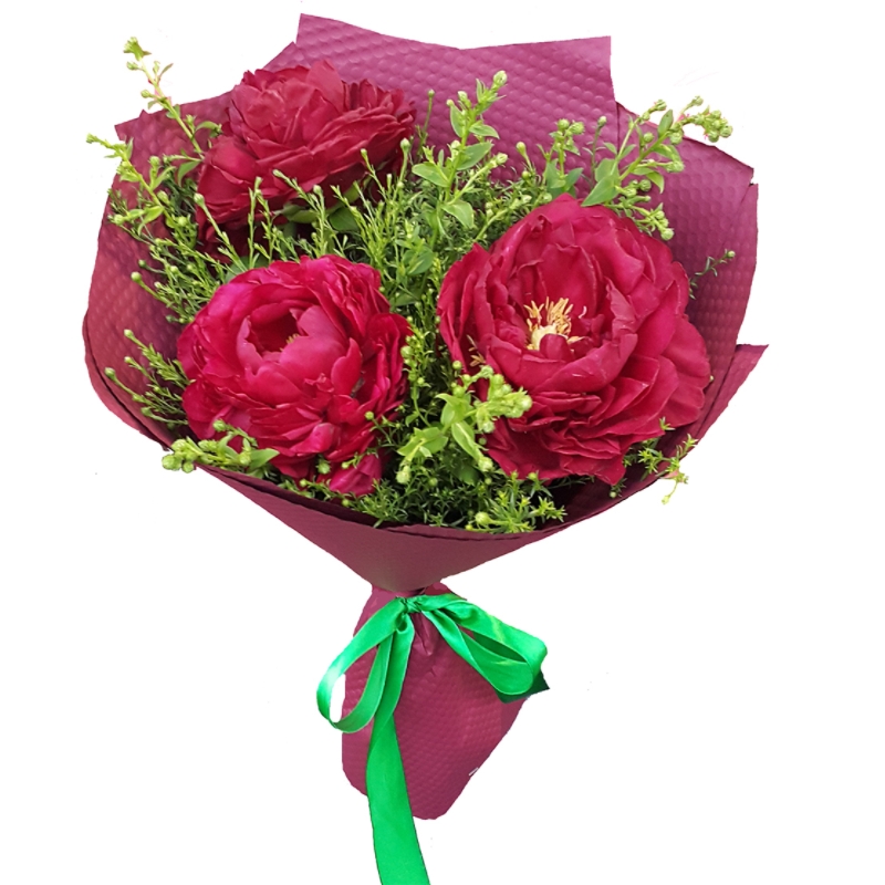 Букет состоит из 3 красных пиона, зелень, красивая упаковка, атласная лента.