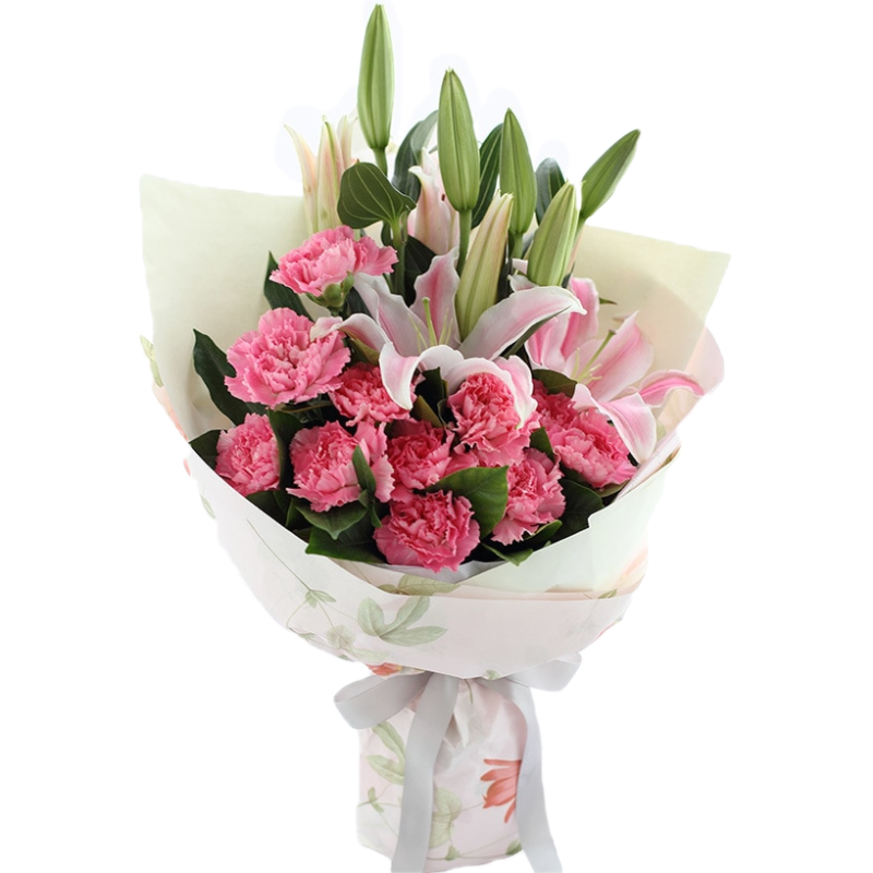 Букет состоит из 11 розовых гвоздик, 3 лилии, зелень, красивая упаковка, атласная лента.