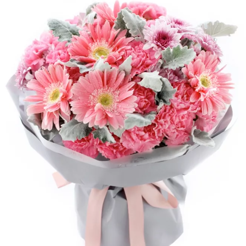 Букет состоит из 19 розовых гвоздик, 5 гербер, 3 ветки хризантемы, красивая упаковка, атласная лента.