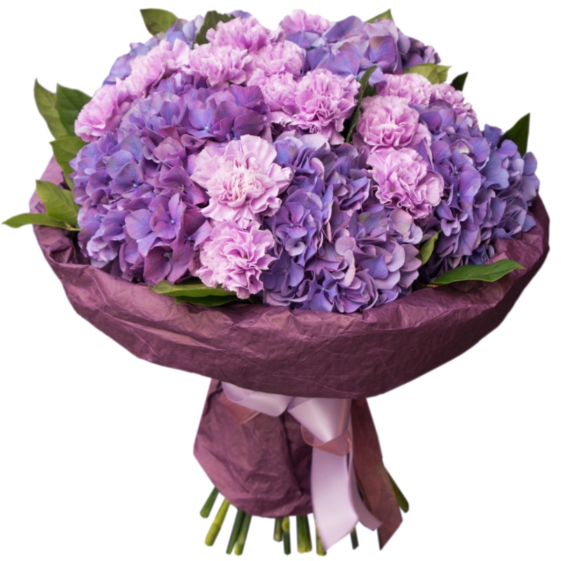 Букет состоит из 5 сиреневых гортензий, 14 гвоздик, зелень, красивая упаковка, атласная лента.