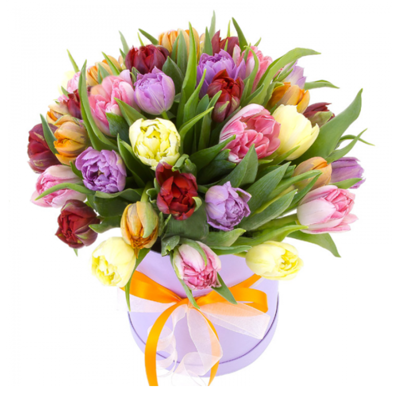 Букет состоит из MIX из 39 тюльпанов, коробка, атласная лента, оазис.