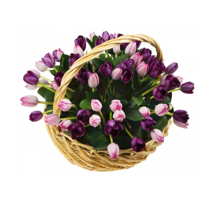 38 сиреневых тюльпанов, 37 розовых тюльпанов, корзина.