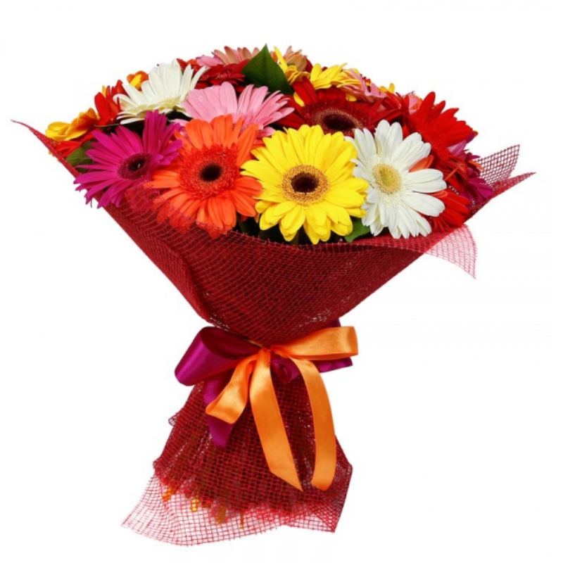 Букет состоит из MIX из 19 гербер, красивая упаковка, атласная лента.