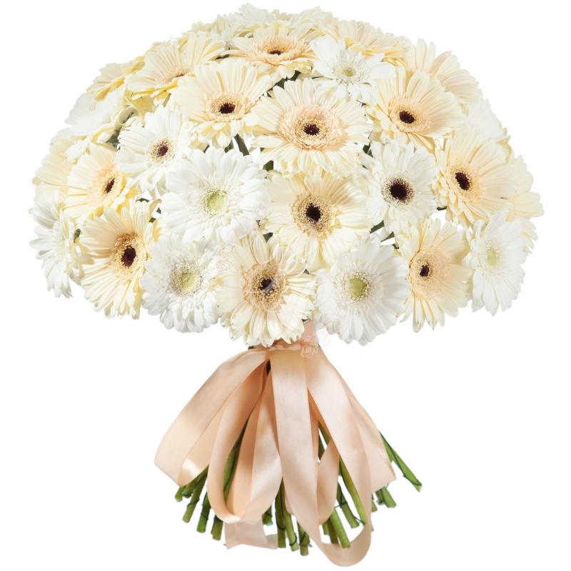 Букет состоит из 35 белых гербер, прозрачная упаковка, атласная лента.
