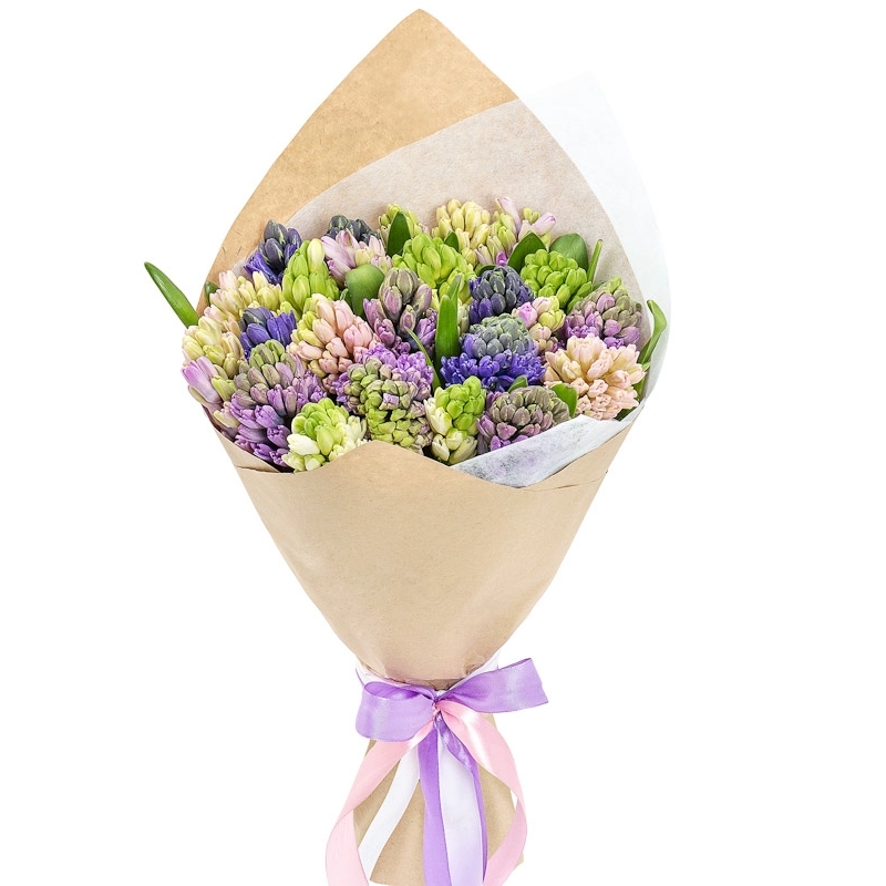 Букет состоит из 21 гиацинт, крафт, атласная лента.