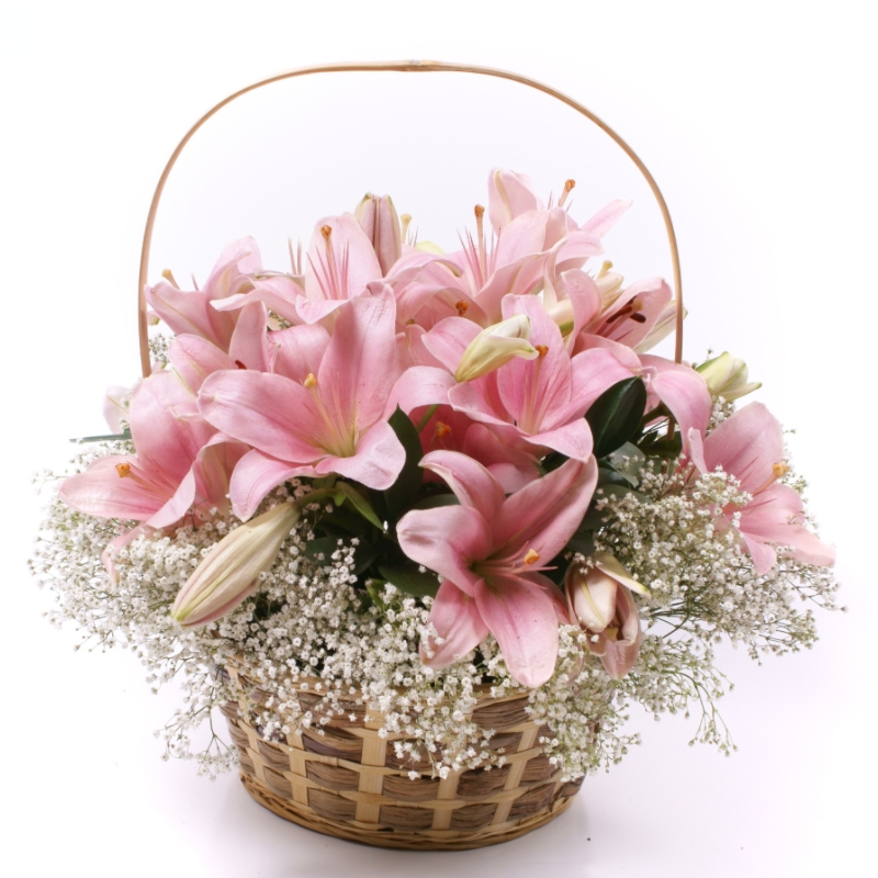 Букет состоит из 7 розовых лилий, 7 гипсофила, корзина, оазис.