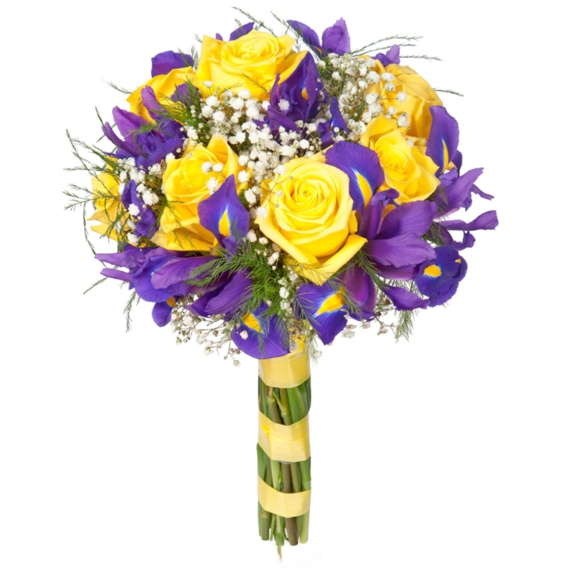 Букет состоит из 7 желтых роз, 11 ирисов, 3 гипсофила, зелень, прозрачная упаковка, атласная лента.