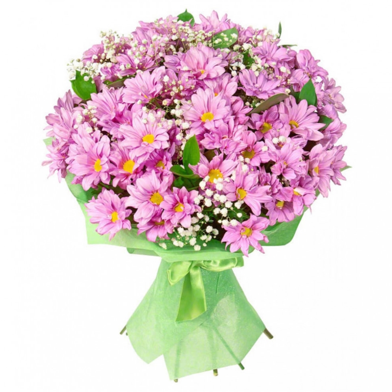 Букет состоит из 7 веток розовой хризантемы, 4 гипсофила, зелень, красивая упаковка, атласная лента.