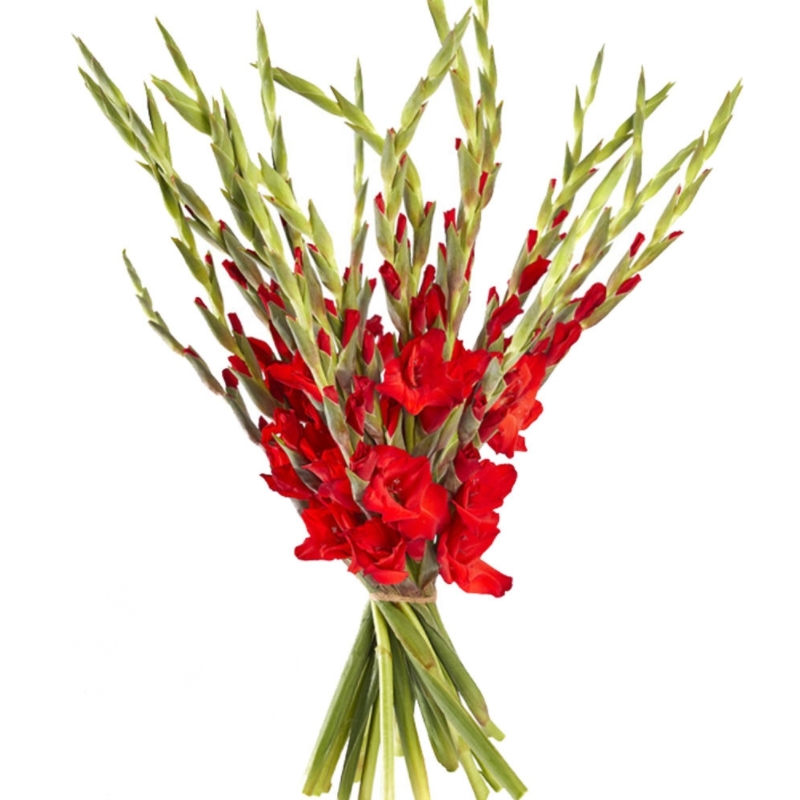 Букет состоит из 15 красных гладиолусов, прозрачная упаковка, атласная лента.