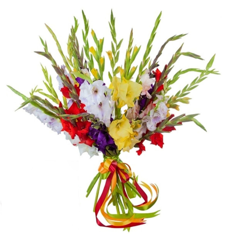 Букет состоит из MIX из 15 гладиолусов, прозрачная упаковка, атласная лента.