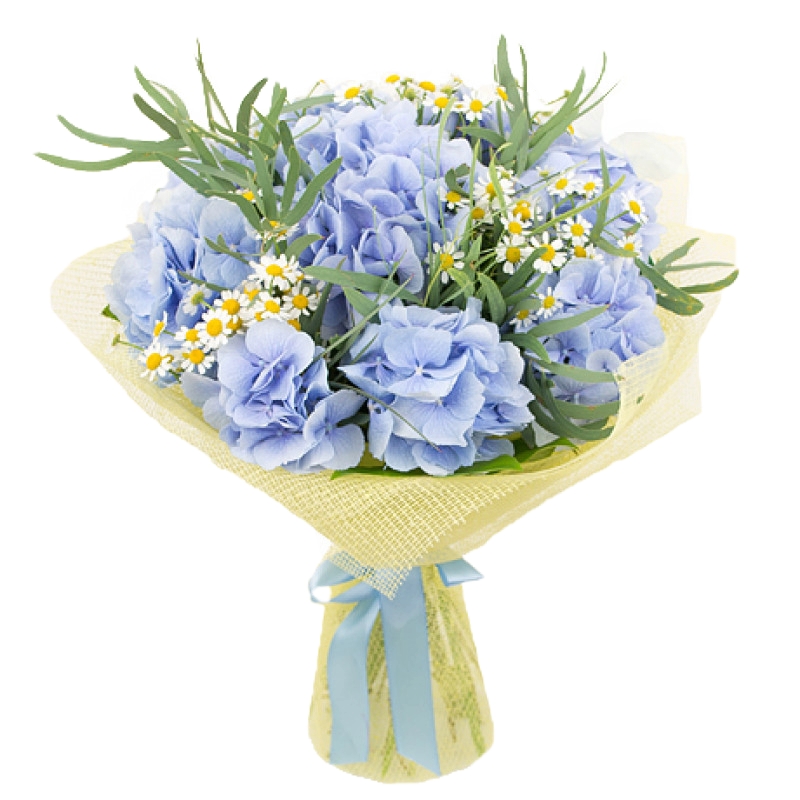 Букет состоит из 5 голубых гортензий, 3 ветки ромашек, зелень, сетка, атласная лента.