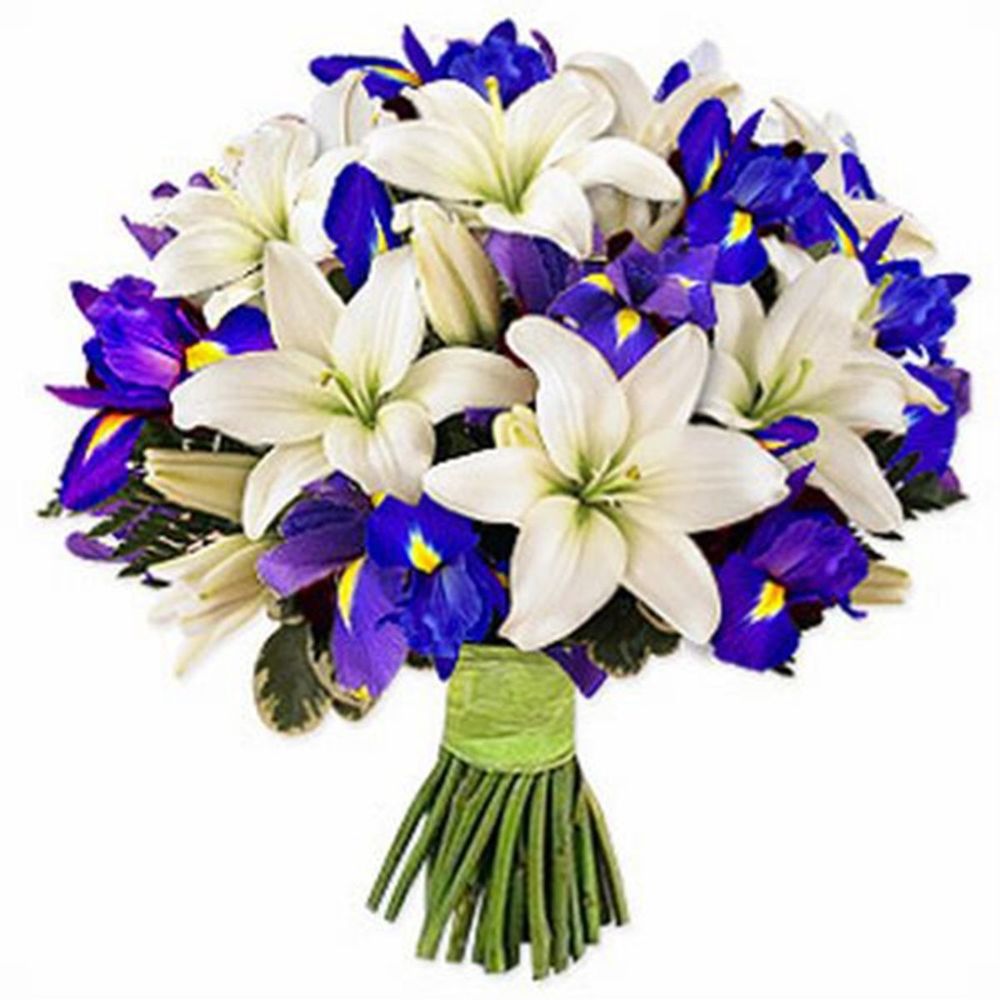 Букет состоит из 5 лилий, 19 ирисов, прозрачная упаковка, атласная лента.