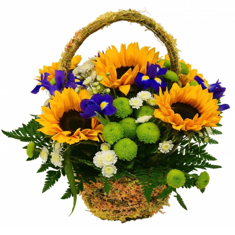 Букет состоит из 5 подсолнухов, 5 ирисов, 7 веток хризантем, папоротник, корзина, оазис.