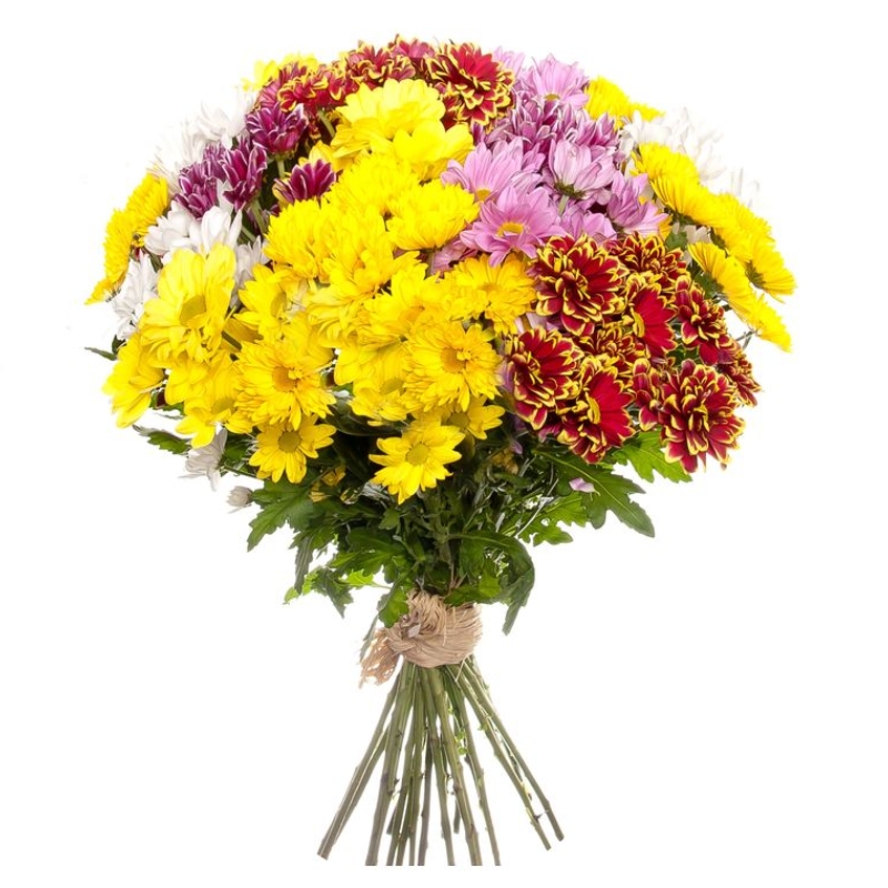 Букет состоит из MIX из 15 веток хризантем, прозрачная упаковка, атласная лента.