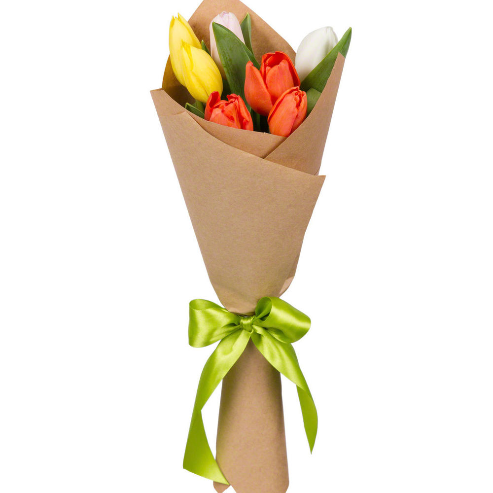 Букет состоит из 3 красных тюльпана, 2 желтых тюльпана, 2 белых тюльпана, крафт, атласная лента.