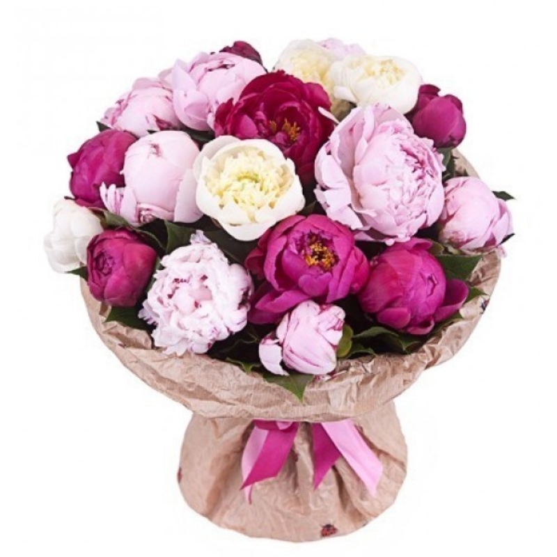 Букет состоит из 8 розовых пионов, 7 красных пионов, 6 белых пионов, крафт, розовая лента.