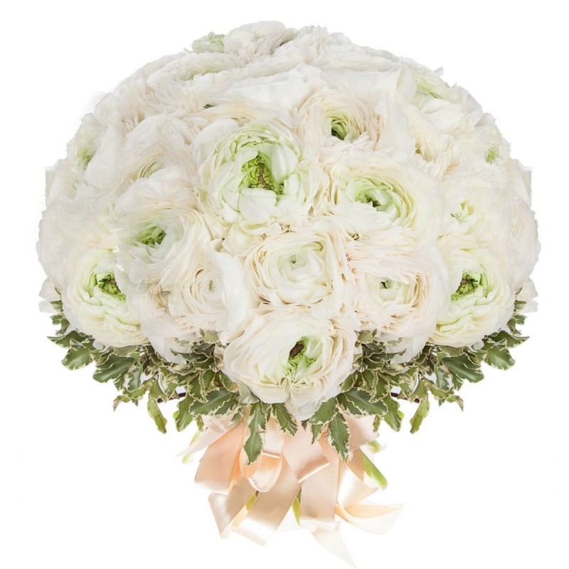 Букет состоит из 39 белых ранункулюсов, зелень, прозрачная упаковка, атласная лента.