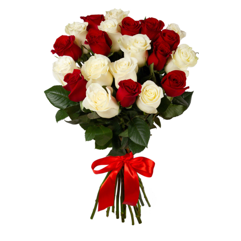 Букет состоит из 21 красная и белая роза, прозрачная упаковка, атласная лента.