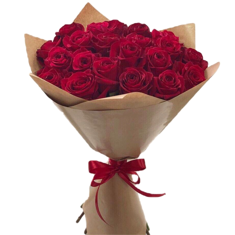 Букет состоит из 21 бордовая роза, крафт, атласная лента.