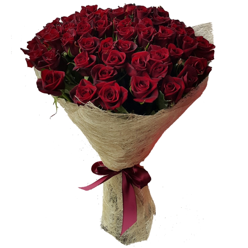 Букет состоит из 45 бордовых роз, сизаль, лента.
