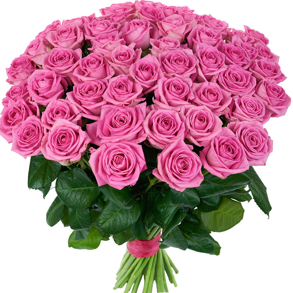 Букет состоит из 55 розовых роз, прозрачная упаковка, розовая лента.