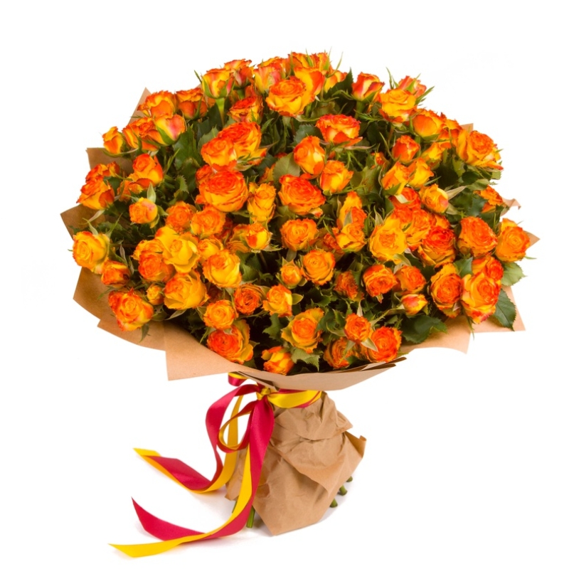 Букет состоит из 25 кустовых оранжевых роз, крафт, атласная лента.