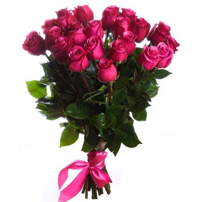 Букет состоит из 21 малиновая роза, прозрачная упаковка, атласная лента.