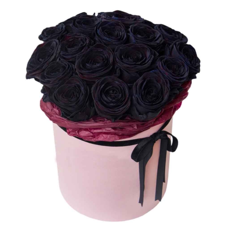 Букет состоит из 19 черных роз, коробка, оазис, лента.