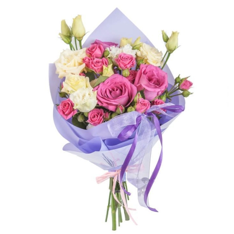 Букет состоит из 3 белые розы, 3 розовые розы, 3 ветки кустовых роз, 2 ветки эустомы, красивая упаковка, атласная лента.