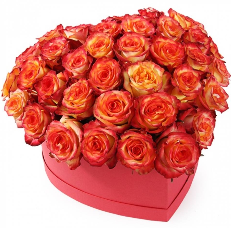 Букет состоит из 35 оранжевых роз, коробка в виде сердца.