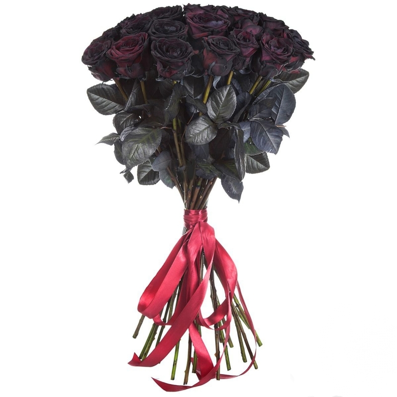 Букет состоит из 25 черных роз, прозрачная упаковка, атласная лента.