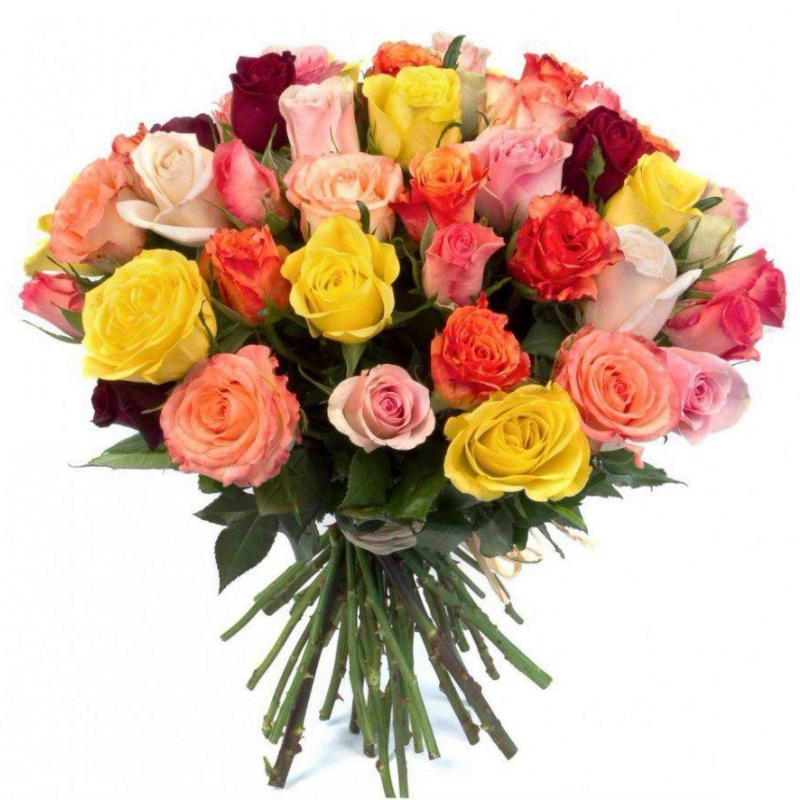 Букет состоит из MIX из 31 розы, прозрачная упаковка, атласная лента.