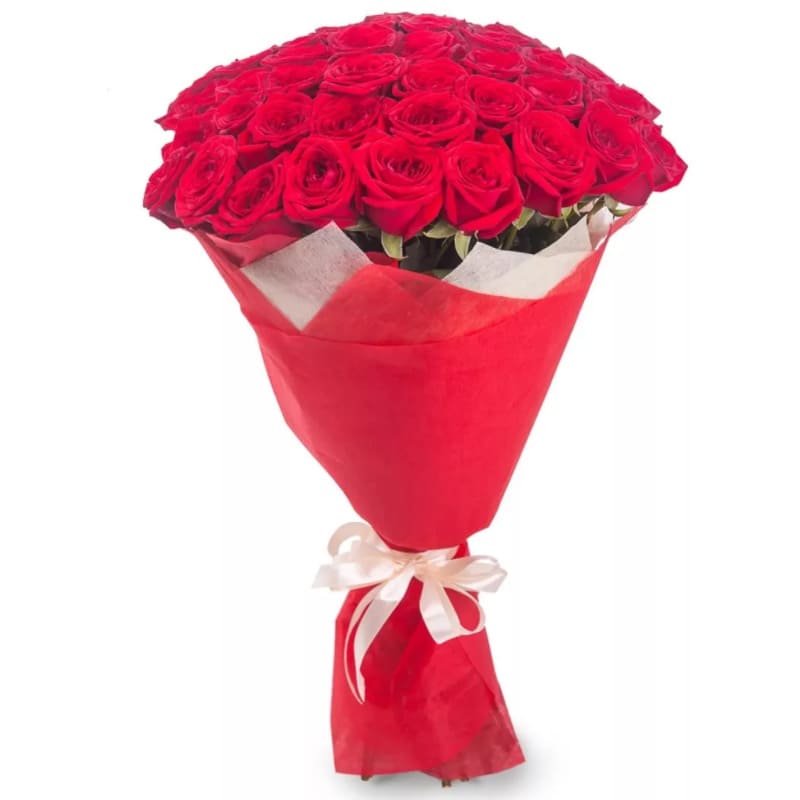 Букет состоит из 45 красных роз, красивая упаковка, атласная лента.