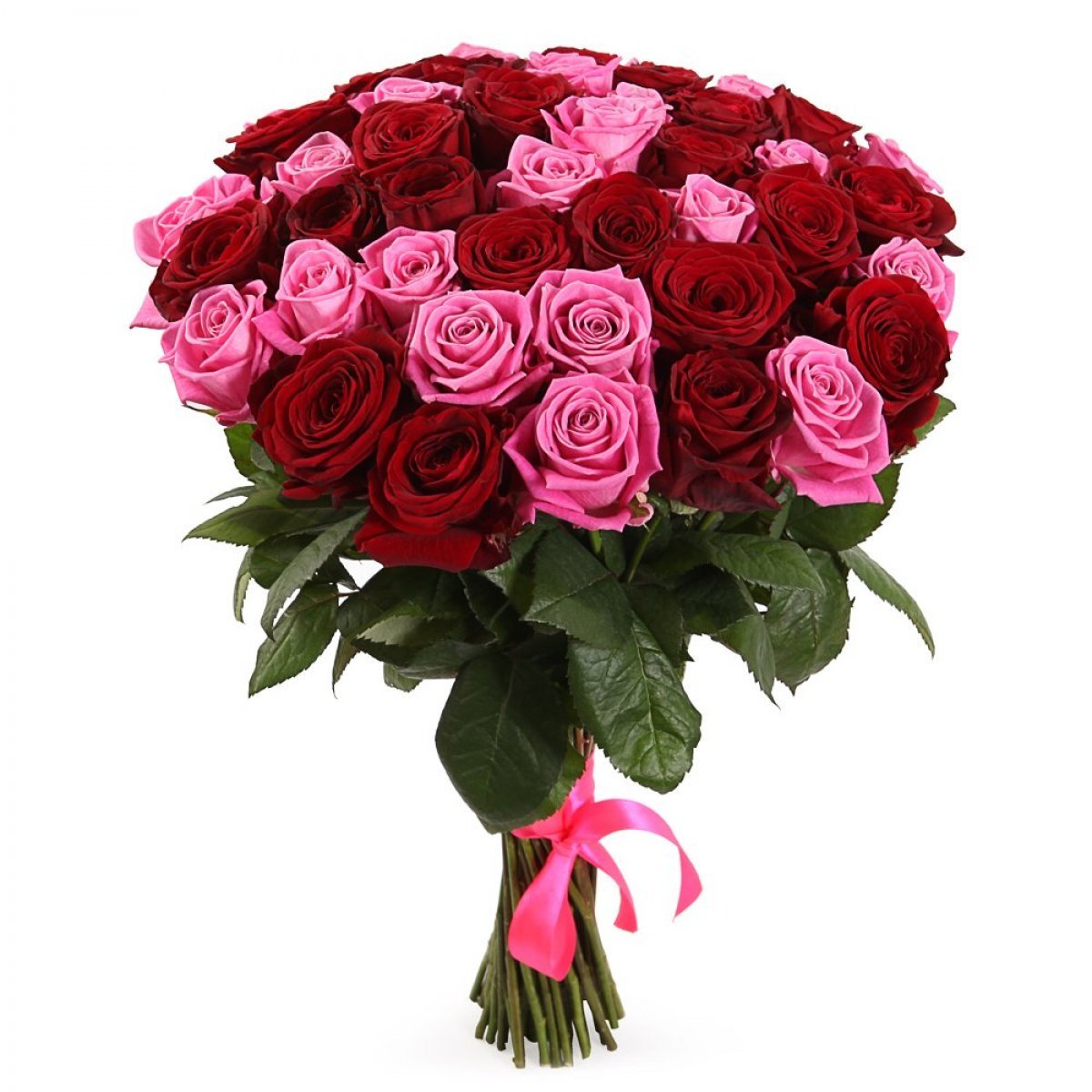 Букет состоит из 23 красные розы, 22 розовые розы, прозрачная упаковка, атласная лента.