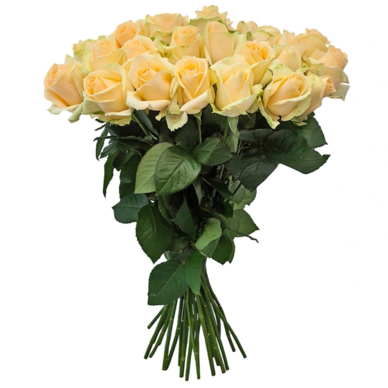 Букет состоит из 31 кремовая роза, прозрачная упаковка, атласная лента.